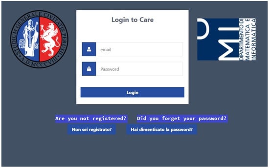 In this section, we briefly describe the Care portal, which allows the interaction between doctors and operators and the work environment, where the images of the patients considered in this study are loaded and processed. This is done precisely to make it clear how this study can practically be useful for an assisted diagnosis of the pathologies examined. The Care portal allows the exams of the patients to be managed before and after the application of the SK algorithm and the whole procedure described above. It allows any user to register, as doctor or operator user (Figure 8).