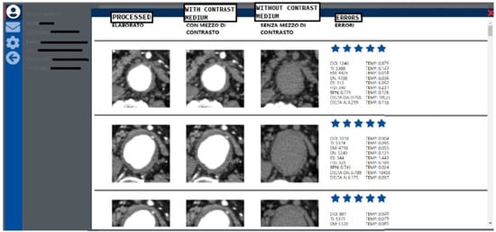 The mutual interaction between doctor and operator begins when the doctor uploads the sequences of images with and without contrast medium, specifying, for each patient, the gender and tax ID code, which will then be anonymized. Once the data packages have been processed by the operator, they are sent back to the doctor user, who can edit some patient data, such as the weight, the height, the age, the smoking habits, and comments about the clinical report (1, in Figure 9) and can access the processed data, in order to check and evaluate the quality of the reconstructions (2, in Figure 9) in terms of a clinical diagnostic point of view. The relative interface is shown in Figure 10, where the doctor can rate (e.g., in terms of stars) the images displayed in each row. The errors, described in Section 3, are also shown summarizing the quantitative numerical results.