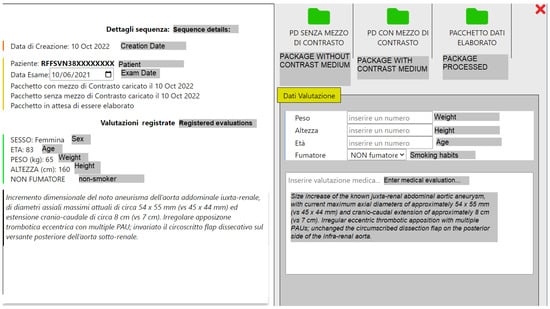 After downloading the images, the operator users proceeded to process them, applying the previously described algorithms, entering the results again on the portal, with the purpose of making them available for clinical evaluation by doctors. In addition to the clinical evaluation, based on a system that provides a rating from a minimum of 1 to a maximum of 5, the doctors edited some patient data, such as the weight, age, height, if smoker or not, and the medical evaluation (report) of the examination, as shown in Figure 11.