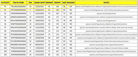 The patients who were the subject of this trial, as can be seen from Figure 13, were both male and female, aged between 65 and 83 years and characterized by a history of systemic arterial hypertension, diabetes, hypercholesterolemia, chronic obstructive pulmonary disease, chronic ischemic coronary artery disease, aortic valve heart disease, transient ischemic attack or bronchial asthma. It should be pointed out that the male sex is more subject to the pathology studied and this explains the numerical difference between the two sexes in the cases taken into consideration. These are the only clinical data needed, as most of the fundamental data for the study is represented by the images to be processed.