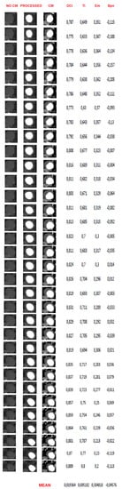 Results of the entire sequence of one of the 15 patients processed. On the left, the basal CT images of the vessel (NO CM), on the right, the CT images of the vessel with the contrast medium (CM), in the center, the reconstructions with the extraction of the patent lumen (i.e., the processed image, ). Next to each slice, we report some of the most significant errors (Dice Coincidence Index, Tanimoto Index, misclassification error and bias index).