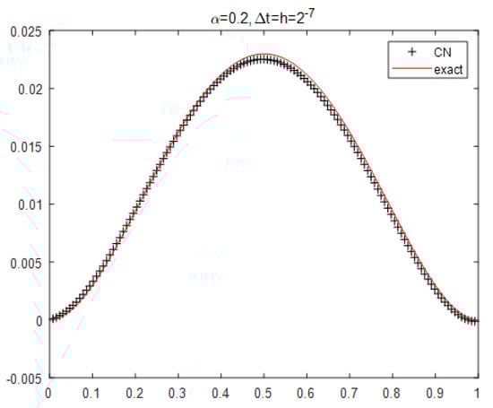 Table 1 shows the convergence rates of the numerical solutions of Example 1 with at the time . The numerical solution matches the exact analytical solution of the fractional differential equation. It shows stability and a convergence order of . Figure 1 shows the numerical solution in Crank-Nicolson format and the exact solution of Example 1, where , at time . Figure 2 shows the numerical solution in Crank-Nicolson format and the exact solution of Example 1, where , at time . Figure 3 shows the numerical solution in Crank-Nicolson format and the exact solution of Example 1, where , at time . The numerical solution compares well with the exact analytic solution to the fractional partial differential equation in this test case.