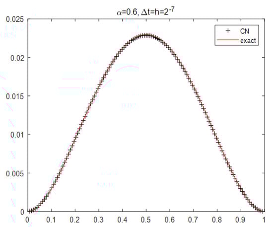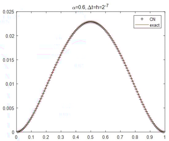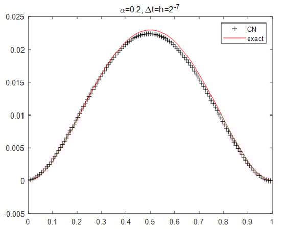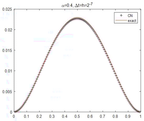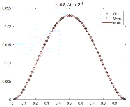 is the Richardson extrapolated solution (see [,]), then can be computed from , where x is a common grid point on both the fine and the coarse meshes, and are the CN solutions at the point x using the coarse grid (grid with h) and the fine grid (grid size ), respectively. In this way, we can obtain second-order accuracy both in space and time.