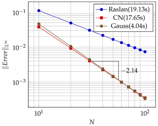 In Table 2, the present results performed better than those of Raslan [36], since both the and the norm values are better. It is also clear from the table that the norm of the present work is better than that of the Crank–Nicolson method (CN) based on [36].