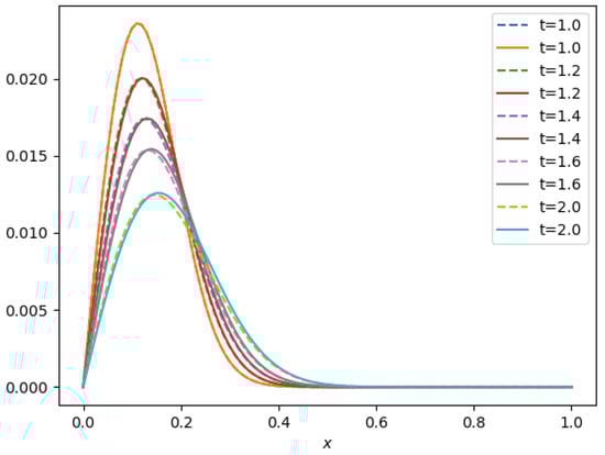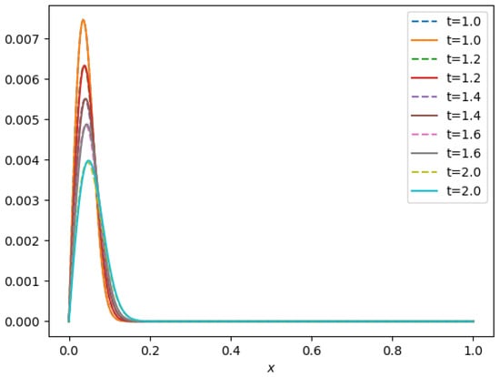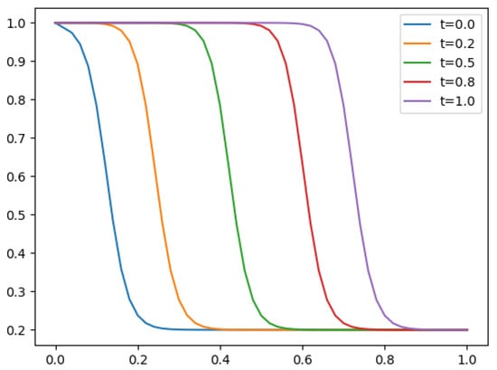 - A travelling wave solution of Burgers’ Equation (14), which is of the formwith the initial conditionand the boundary conditions , where , and are constants, is considered. We compare the norms of the errors at various times when the number of partitions of the space interval [0, 1] is , the number of time steps is and the final time is . Figure 3 shows the profiles at some values of t for all x. The graph of the exact solution is overlaid onto that of the approximate solution in Figure 4. The exact and approximate solutions match perfectly on the computational domain. It is clearly shown in Figure 5 that our method has convergence order two and is three times faster than CN.