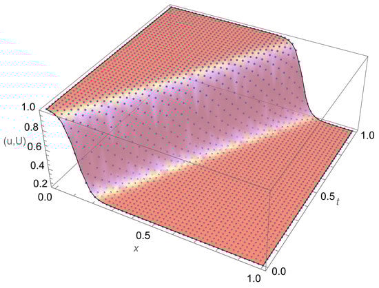 In Figure 1, a 3D plot of the exact solution is overlaid onto that of the approximate solution of Burgers’ equation in example 1. It is evident that the approximate and exact solutions match perfectly on the computational domain. Furthermore, in Figure 2, the convergence of the different methods and the CPU times for Raslan [36], the Crank–Nicolson method based on Raslan, and quadratic spline collocation on Gauss points for computation of this example are shown. It is clear that the OCFE method has order-two convergence, and the present method is the fastest of the three methods and nearly five times faster than Raslan [36] and four times faster than CN.
