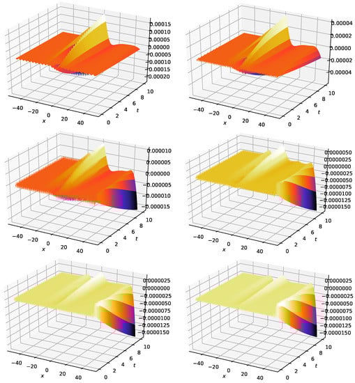 3D plot of error of KdV–Burgers when (top: left to right), (middle: left to right) and (bottom: left to right).