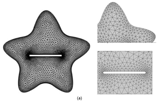 This test provides the sensitivity of the solution to the mesh refinement. By performing this test, it can be seen that by making the size of the elements smaller, the computed solution becomes less sensitive. Figure 2b is exhibited to show the grid dependency test for = 0.02, Ra = and , with the Nusselt number as a sensitive variable. It is observed that when the number of elements reaches 22,728, the average Nusselt number does not significantly vary. Therefore, all computations are performed at this element number, which is finer level of meshing.