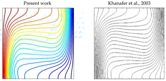 To ensure the accuracy and credibility of the established numerical model, a quantitative verification is performed by comparing the obtained values of the Nusselt number with the findings of Khanafer et al. [4]. In addition, a qualitative verification is performed by comparing the isotherms (Figure 3) for , Pr = 6.2, and with the results of Khanafer et al. [4]. The comparisons presented in Table 2 and Figure 3 show a very good concordance between the results.