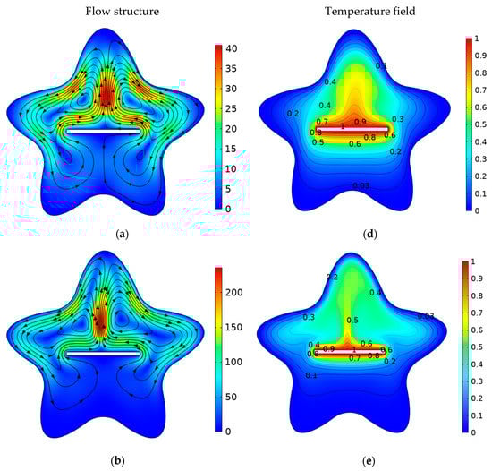 Flow structures (a–c) and temperature fields (d–f) for Ra = 105, and various Hartman number (Ha) values. (a) Ha = 0; (b) Ha = 40; (c) Ha = 80; (d) Ha = 0; (e) Ha = 40; (f) Ha = 80.