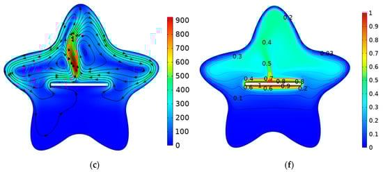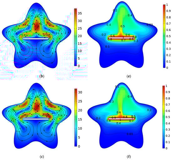 Figure 5 illustrates the effect of the Hartman number of temperature and the velocity distributions for Ra = 105 and . Higher values of the Hartman number indicate a higher magnitude of the applied magnetic field. Figure 5a–c describe the nanofluid flow behavior for various Hartmann numbers (Ha). The velocity magnitude decreases with the increase in the Ha. This is due to the generated Lorentz forces, which oppose the fluid motion and reduce the flow intensity. Figure 5d–f describe the effect of the application of the external magnetic field on the temperature field. As previously mentioned, the applied magnetic field opposed the convective flow; thus, by increasing the Hartman number, the temperature gradients are reduced, especially close to the active walls.