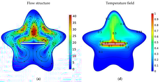 Figure 4 illustrates the flow structures and temperature fields for Pr = 6.2, Ha = 25, and various Rayleigh number (Ra) values. From Figure 4a–c, it can be noted that when increasing the Rayleigh number (Ra), the magnitude of velocity increases. This increase is due to the enhancement of the buoyancy force generated by the density variations, especially close to the active hot and cold walls.
