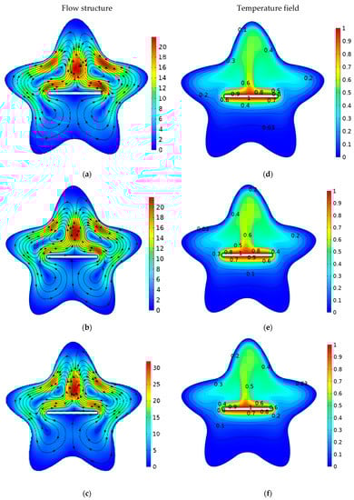 Flow structures (a–c) and temperature fields (d–f) for Ha = 25, and various Rayleigh number (Ra) values. (a) Ra = 104; (b) Ra = 105; (c) Ra = 106; (d) Ra = 104; (e) Ra = 105; (f) Ra = 106.