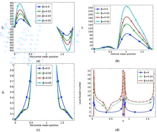Figure 7a exhibits the profile of the horizontal velocity, components () against the solid volume fraction () by sketching the cutline at y = 0 and varying from . The velocity profile is discontinued due to the presence of the plate at . The velocity increases by increasing the nanoparticle volume fraction () due the enhancement of the buoyancy force. Figure 7b presents of the profile of the vertical velocity component () against the solid volume fraction () by sketching the cutline at x = 0 and varying from . Figure 7c displays the variation in the temperature distribution against () by drawing a cut line at y = 0 and varying x from −1 to 1. 5. It is obvious that when the volume fraction of multiple walled carbon nanotube parameter rises, the temperature of fluid also increases. Figure 7d shows the local heat transfer around the rectangular heated plate. The local Nusselt number rises as the volume fraction of the MWCNT–water nanofluid increases. As the Nusselt number is the ratio of the convective to conductive heat transport in a fluid, the use of the MWCNTs increases the convective heat transfer in the fluid through the enhancement of the thermophysical properties. The highest heat transfer rate occurs for ().