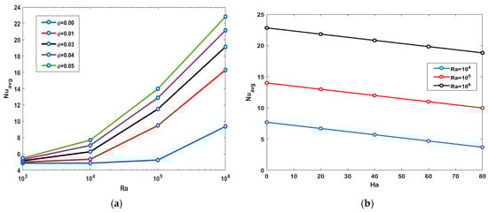 Figure 8a presents the effect of the Rayleigh number on the average Nusselt number for various nanoparticle volume fractions for Pr = 6.2 and . The increase in Ra values leads to the intensification of the convective recirculation flows, which causes the enhancement of the heat transfer rate. Similarly, the average Nusselt number is increased by the increase in the nanoparticle volume fraction due to the enhancement of the thermophysical properties. Figure 8b depicts the impact of the Hartmann number at various Rayleigh numbers on the average Nusselt number for Pr = 6.2 and .