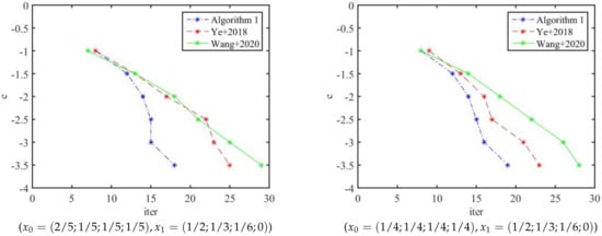 and the mapping satisfies , (I is the identity mapping). It is obvious that mapping F has pesdo-monotonicity and is a demi-contractive mapping. , in our Algorithm 1, we let , . Numerical observations for Example 2 are shown in Table 1 and Table 2, Figure 1.