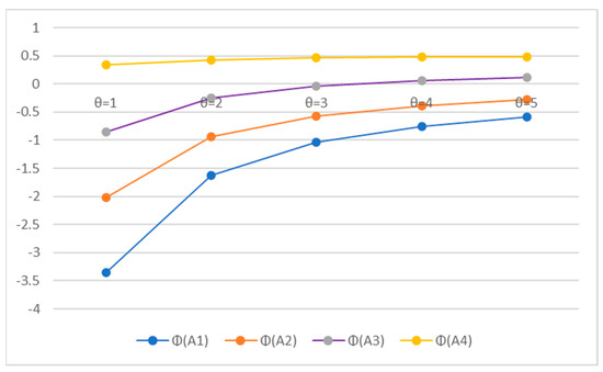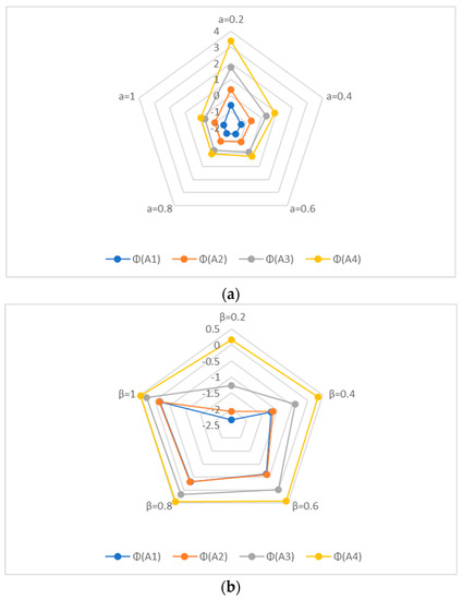 (2) The difference between different parameter values is that the total dominance degree of pharmaceutical e-commerce platforms is different with different parameters, and the degree of differentiation between pharmaceutical e-commerce platforms is also different. According to Figure 1, the total dominance of each pharmaceutical e-commerce platform increases as increases. reflects the degree of sensitivity of the decision-maker to risk. The greater is, the lower the degree of risk aversion of the decision-maker is. That is, when facing risk, the smaller the impact of loss of the decision-makers and the smaller the gap of dominance degree between pharmaceutical e-commerce platforms will be. On the contrary, the smaller is, the higher the degree of risk aversion of decision-maker and the greater the gap of dominance degree between pharmaceutical e-commerce platforms. According to Figure 2a, with the increase of , the total dominance of pharmaceutical e-commerce platforms gradually decreases, and the gap between pharmaceutical e-commerce platforms is also gradually narrowed. Similarly, according to Figure 2b, the total dominance of pharmaceutical e-commerce platforms increases with the increase of , and the gap between pharmaceutical e-commerce platforms is also narrowed.