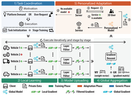 Even though various solutions are proposed by using FL to upgrade the model learning paradigm of 3D [10,11,12], they are still incapable of handling the dynamics and heterogeneity encountered in the daily usage of 3D. First, most recent research is conducted based on predefined experimental settings, in which clients possess preassigned data and exchange model parameters directly without any optimizations. Specifically, in more realistic scenarios, data can be sensed continuously. Since current solutions focus more on old data, if they are applied to the incremental data directly, it may make the model learning inefficient, leading to catastrophic forgetting of knowledge [13]. Second, even though current solutions based on FL do not need to transmit raw data, it is still costly to train high-performance models based on more frequent and excessive client–server interactions [9]. Finally, it is common to see that the availability of local data and computing powers of moving vehicles may change over time and place, and this may make current solutions inefficient at not only accommodating heterogeneous devices but also data with various distributions, uneven sizes, and missing label classes [9,14,15].