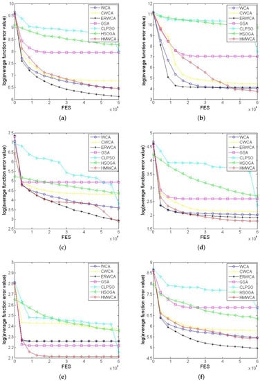 From Table 5, we can see that for unimodal functions –, the HMWCA is significantly better than the CWCA, GSA, CLPSO and HSOGA, while the ER_WCA achieves the best results for all functions. This might be because the gravitational search reduces the exploitation ability of the HMWCA. For simple multimodal functions –, the HMWCA obtains the best results for , and , the ER_WCA obtains the best results for and , while the CWCA, GSA and WCA have the best results for , and , respectively, and CLPSO obtains the best results for , and . In particular, the HMWCA and GSA obtain the best results for , while the CWCA and CLPSO have the best results for . For hybrid functions –, the HMWCA obtains the results for , and , while the ER_WCA has the best results for , and . For composition functions –, the HMWCA obtains the best results for and , the GSA has the best results for and , the HSOGA obtains the best results for –, and the CWCA obtains the best results for . According to the statistical results of the Wilcoxon’s rank sum test reported in Table 5, the HMWCA is better than the WCA, CWCA, ER_WCA, GSA, CLPSO and HSOGA for the 22, 24, 21, 24, 22, and 26 test functions, respectively, equivalent on 0, 0, 0, 1, 0, and 0 test functions, respectively, and slightly worse on 8, 6, 9, 5, 8, and 4 test functions, respectively. Furthermore, in terms of their average rank, the WCA, CWCA, ER_WCA, GSA, CLPSO, HSOGA and HMWCA obtain , , , , , and for all functions, respectively. Therefore, the HMWCA is a more promising optimizer.