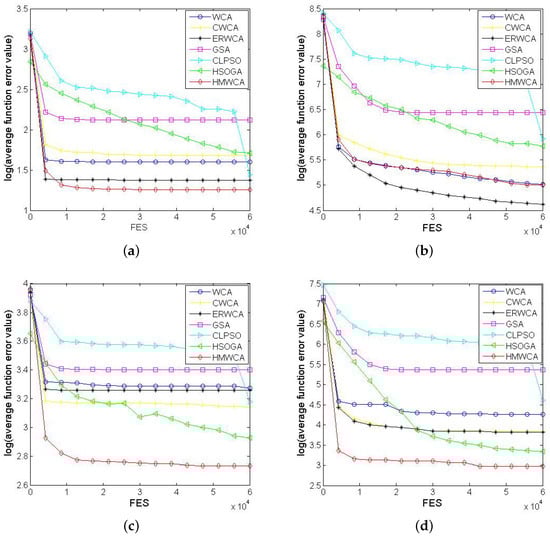 The evolution curves of the seven studied algorithms for functions (a) , (b) , (c) , (d) with .