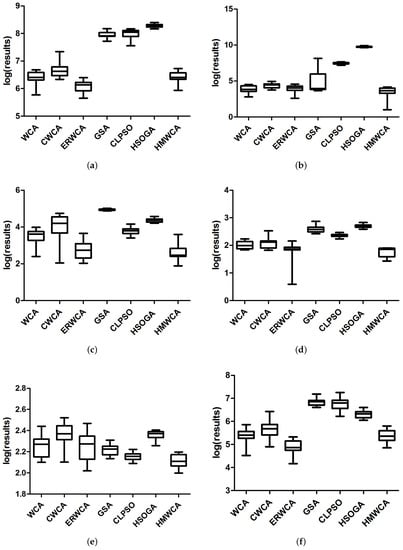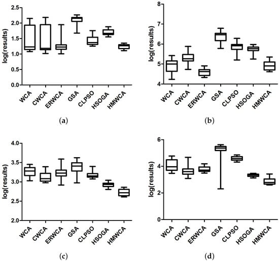 For clarity, the evolution curves of these compared algorithms on ten functions, including , , , , , , , , and , are plotted in Figure 1 and Figure 2, and their results from 25 independent runs are compared in Figure 3 and Figure 4. From Figure 1, Figure 2, Figure 3 and Figure 4, we can see that the HMWCA has a more promising performance than others. In detail, for unimodal functions and , the HMWCA has a better exploration ability than the WCA and ER_WCA, and worse than the GSA. Meanwhile, for complex functions, the HMWCA has a better performance for most functions, especially for , , and . Therefore, the HMWCA has an effective performance.