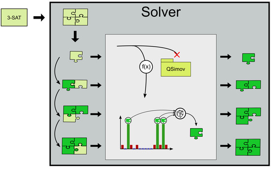 19], a sort of cooperative quantum searching in which Boolean variables are split into two sets. In one of them, the values of the variables are set by a local search algorithm, such as, for example, GenSAT; in the other set, Grover’s searching algorithm is applied.