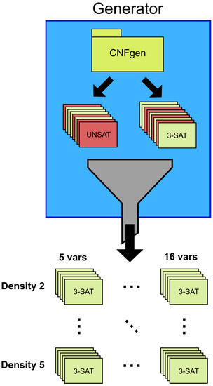 31]. In particular, 10 3-SAT problems were generated for each pair (density, number of variables): in total, 4 × 12 different test cases, which compute 480 3-SAT problems. The density values range from 2 to 5 (both included). The number of variables ranges from 5 to 16 since, below 5, this incremental scheme is not needed because computing requirements are affordable enough and, over 16, it is more computationally expensive which, as evidence was found that the advantage we provide could be made smaller, meant that we did not consider using bigger values.
