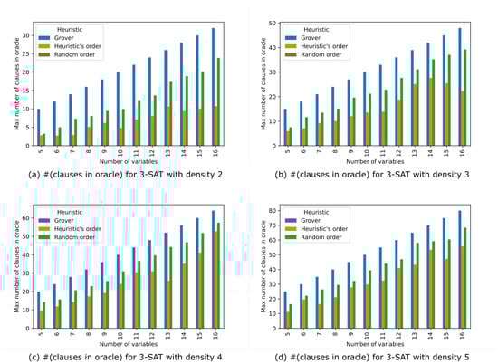 Another very important part of the quantum algorithm is performing the oracle, where the amount of clauses directly affects the number of ancillary qubits required; therefore, the next four graphs are devoted to measuring this fact, again using the densities of 3-SAT formulas. The results obtained clearly show the advantage of the proposed algorithm (
