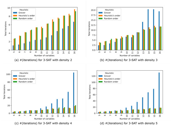 The next four raphs are devoted to capturing issues within the temporal computational complexity. In particular, we measured the number of Grover’s iterations. The following results show that our algorithm requires both a high number of variables as well as high-density formulas in order to improve the results of the original Grover’s algorithm (