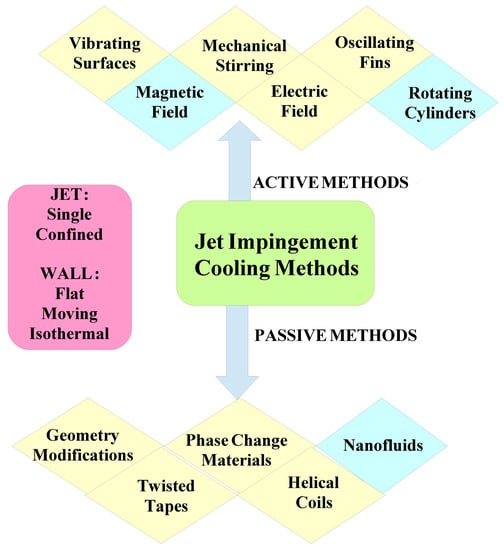 Different available methods that can be used for flow control and thermal performance improvement of jet impingement cooling.