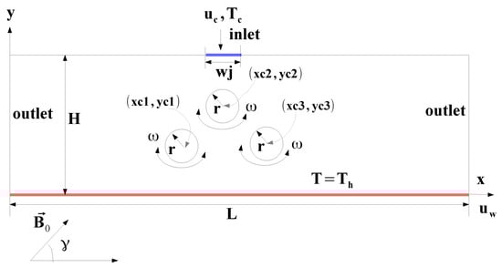 Many different methods of HT enhancement have been considered in J-I cooling. MGF and NF applications have been discussed above. The utilization of rotating circular cylinders (CCs) in HT has been considered before in many studies. The size, rotational speed, conductivity ratio and location of the CCs are some of the most influencing factors for the overall thermal performance [,,]. In J-I systems, cooling of rotating hot surfaces has been considered in several studies [,,], but rotating CCs as a control method for cooling performance of SJ-I onto a hot flat surface has only been considered in [].