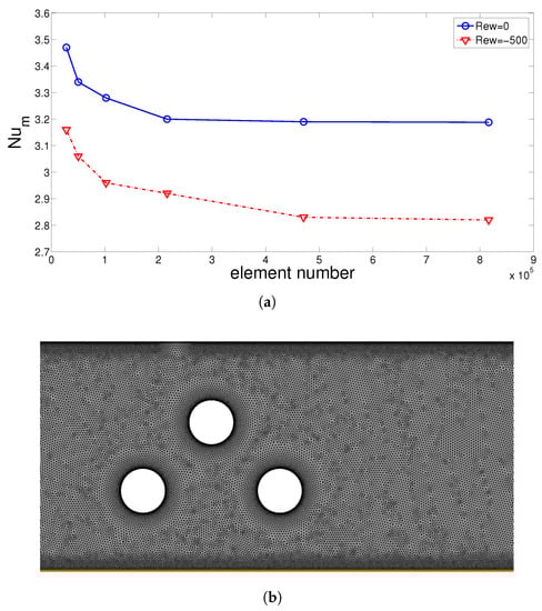 Grid independence test results are shown in Figure 3a considering average Nu variations with different grid sizes at two different rotations of CCs (Rew = 0 and Rew = −500). A grid with 470,870 number of triangular elements is selected, and its variation in the domain near the CCs is given in Figure 3b. Near-wall refinement is performed.