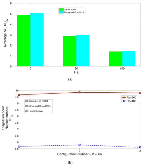 Validation of the code is performed by using different available studies. In the first work, convection in a differentially cavity under MGF effects is analyzed. Comparison results of average Nu at three different MGF strength are shown in Figure 4a by using the available results in []. The value of the Grashof number is fixed to while Ha values of 0, 50 and 100 are taken. The highest difference is seen at Ha = 0, and it is below 5%. For SJ-I cooling, the results available in [,] are used. An isothermal plate is considered while Re values of 100 and 300 are taken. The maximum difference between the available results is below 4% (Figure 4b). The MGF effects in convection and SJ-I cooling effects are accurately captured by using the current solver.