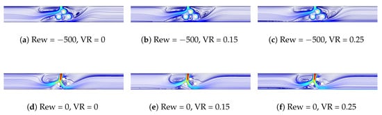 Figure 5 shows the impacts of rotational speeds of the CCs on the streamline variation at two different velocity of the hot wall. In the case of non-moving wall and without the activation of the CCs, vortices form near the inlet due to confinement and entrainment, while the right vortex is smaller in size due to the existence of the CC. A large elongated vortex near the right CC is formed, which extends toward the upper plate. When the CCs start to rotate with higher speeds, the sizes of the inlet region vortices are reduced, while vortices near the left and right CC on the bottom wall are established, and their sizes increase with higher speeds. When the hot bottom wall moves in +x direction without rotation of the CCs, a large vortex on the left bottom wall is formed. When the value of Rew is increased, this vortex zone expands in vertical direction while suppression of the inlet vortices with rotations of the CCs is obtained with higher Rew. Due to the wall movement, no vortex is formed on the right part of the inlet near the bottom wall which exists at VR = 0.