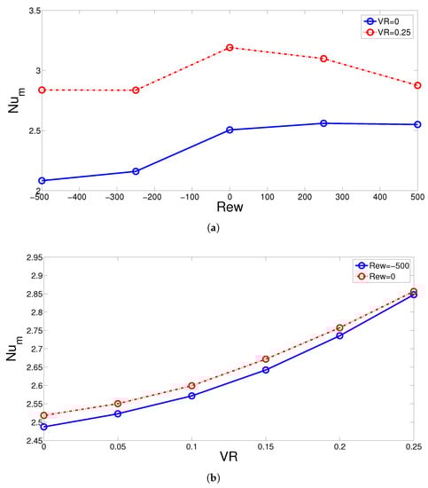 Average Nu versus Rew (a) and versus VR (b) (Ha = 5, Mx = −1).