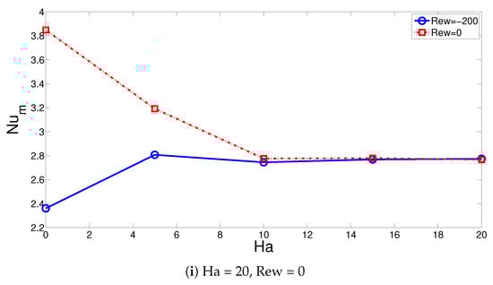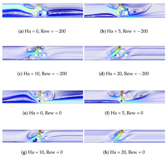 The impacts of MGF strength on streamline variations are shown in Figure 8a–h considering both rotating and non-rotating CC cases. When CCs are not rotating (Rew = 0) at Ha = 0, large vortices near the bottom wall (left part), near the right CC on the top wall and near the inlet are established. When MGF strength is increased to Ha = 5, the top and bottom wall vortices are significantly suppressed while at the highest MGF strength (Ha = 20), and most have disappeared. Similar observations can be made with higher MGF strength when the rotations of the CCs become active. In the case of no MGF, two large elongated vortices are formed in the left and right part of the bottom wall that result from the combined utilization of rotation and movement of the hot wall. As the Ha value is increased, the extent of this vortex is largely suppressed. The suppression of vortices due to the complex interaction of the SJ-I, shear effects due to the wall movement and rotation of the CCs are seen by imposing the MGF and increasing its strength. The HT behavior shows different characteristics when imposing the MGF effects depending upon if the rotations are active or not. When the rotations of the CCs are not considered, reduction of the HT is seen until Ha = 10, and after this Ha, it is slightly varying. The amount of HT reduction becomes 28% until Ha = 10 at Rew = 0 (Figure 8i). However, when rotations become active at Rew = −200, the average Nu rises by about 18.6% by increasing the MGF strength at Ha = 5. Further increment of MF strength has little influence on the variation of average Nu. As the rotations of the CCs are activated, the average Nu values are higher until Ha = 10 compared with the non-rotating cylinder case and then become almost identical after this value until Ha = 20. This is attributed to the rotations of the cylinders, which deflect the fluid flow toward the upper wall in the left region of the inlet while effective impinging to the hot wall is hindered. When MGF is used for rotating case, the amount of deflection of this fluid flow toward the upper wall becomes reduced.