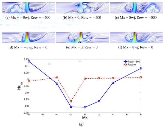 The horizontal location of the multiple rotating CCs influence on the flow patterns, as shown in Figure 9a–f considering rotating and non-rotating CCs. When the rotating CCs are away from the inlet jet, large recirculations are formed near the inlet while effective impinging of the jet onto the hot moving plate is obtained. When the rotating CCs are near the inlet jet, due to the rotations of the CCs, inlet vortices are damped out and mechanism of the HT is mainly due to the rotating effects of CCs in contrast to jet impingement HT. When rotations are not used at location Mx = 0, the deflection of the impinging jet on the hot surface is seen due to the presence of stationary bottom cylinder, while below it, a small vortex is established. Average Nu versus location (Mx) of the CCs is shown in Figure 9g. The horizontal location closer to the inlet results in lower HT rates when rotations are active at Rew = −500. Higher Nu values are obtained when the rotating CCs become way from the inlet in horizontal direction. Compared with the case of Mx = 0, average Nu enhancements of 12% and 7.5% are obtained for cases with locations of Mx = −8 and 8. For both rotating and non-rotating CC case, the location of Mx = −2 provides the lowest value of average Nu, where the upper CC is just located below the inlet jet and horizontal distance between the cylinder center and jet center becomes 0. A sudden increment in average Nu is seen when the rotations are not active if Mx is increased from Mx = −2 to Mx = 0, which is not the case with rotations of the CCs due to the rotational effects that hinder the effective impingement of cold fluid onto the hot surface.
