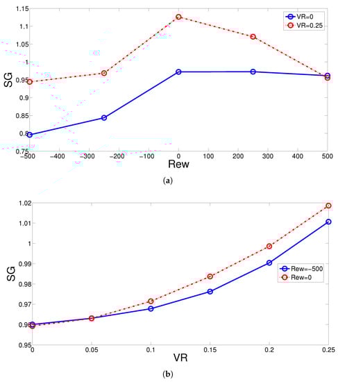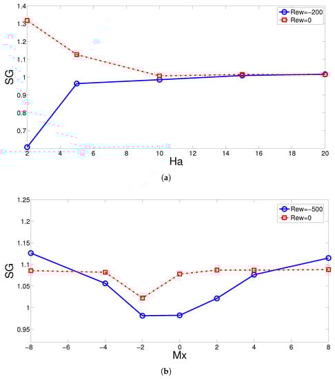 EG-A is also considered for the SJ-I problem under combined effects of rotational CCs and MGF. Variations of normalized EG with respect to changes rotational speed of the CCs (Rew) and hot wall velocity (VR) are given in Figure 10. As the velocity of the hot wall is not significant, the shear-driven effects due to wall movement are not profound. The SG values show the dominance of HT irreversibility, while EG generation achieves the minimum value when non-rotating CC case is considered. Higher velocities of the moving wall result in higher entropy production due to the higher HT and viscous irreversibility. At the highest VR, the discrepancy between the rotating and non-rotating increases. The EG rises by about 6.25%/ for non-rotating/rotating cases when comparing the moving wall case (VR = 0.25) with the stationary wall case (VR = 0). The reductions of the EG by activation of rotations in CW direction of the CCs at the highest speed become 18.5% and 16.5% for cases of VR = 0 and VR = 0.25. Depending upon whether the rotations are active or not, the EG shows different behavior with higher MGF strength. For stationary CCs, EG is reduced by about 23% at the highest MGF strength, while it is increased by about 66% for non-stationary CCs at Rew = −200. The behavior shows similar trends as in the average Nu variations due to the higher irreversibility in the HT, as the wall velocity is not significant. The location of the rotating CCs closer to the inlet position in horizontal direction produces less entropy, while for both cases the EG rises with higher Mx (Figure 11).