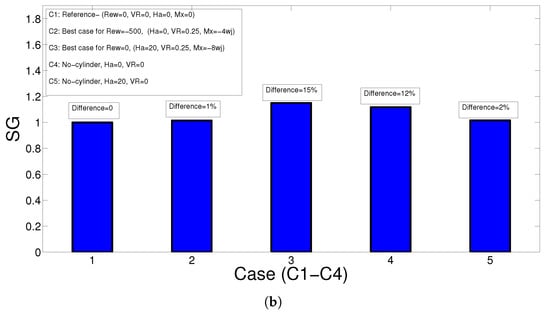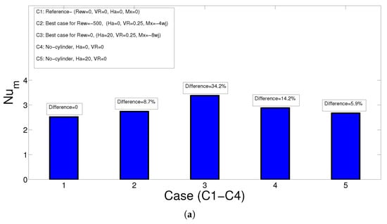 A summary of different cases in terms of thermal performance and production of entropy is shown in Figure 12. Case 1 (C1) shows the reference configuration for the set of parameters (Rew = 0, VR = 0, Ha = 0, Mx = 0) where non-rotating CCs with stationary hot wall is considered without MGF effects. When rotations are active at Rew = −500, the best case is obtained for (Ha, VR, Mx) = (0, 0.25, −4wj), while thermal performance improvement becomes 8.7%, and without rotation, improvement of up to 34.2% is obtained at (Ha, VR, Mx) = (20, 0.25, −8wj). When no cylinders are installed in the SJ-I system, thermal performance improvements of 14.2% and 5.9% are obtained compared with the reference case at Ha = 0 and Ha = 20. When EG performances are compared, the highest EG is obtained for case 3, which is 15% higher than the reference case. Case 2 has only 1% higher EG than the reference case. When movement of the wall is not considered, even without installation of CCs, the EG becomes higher either with (Ha = 20) or without MGF effects (Ha = 0).