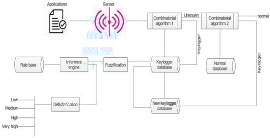 This study developed a combinatorial-based fuzzy inference system for keylogger detection (CaFISKLD). The developed CaFISKLD is divided into three major phases: dataset generation, keylogger detection, and keylogger classification. First, the Java programming language was used to create randomly generated ASCII-coded sequence data. The ASCII-coded sequence data was chosen to replicate the log of keystrokes by keylogger spyware. The generated data was divided into normal and keylogger databases. Second, the generated databases were then fed into a back-to-back combinatorial algorithm to detect keylogger patterns. The first combinatorial algorithm uses the keylogger database to detect keyloggers based on a threshold score. Similarly, the second combinatorial algorithm uses the normal database to detect keyloggers based on a threshold score. The justification for the back-to-back combinatorial algorithms based on the two databases is the combination of the advantages of the signature-based and anomaly-based detection methods. Finally, the detected keyloggers were classified into different severity levels using a fuzzy inference system. Figure 1 describes the architecture of the developed CaFISKLD.