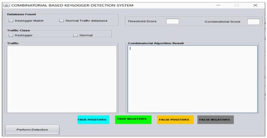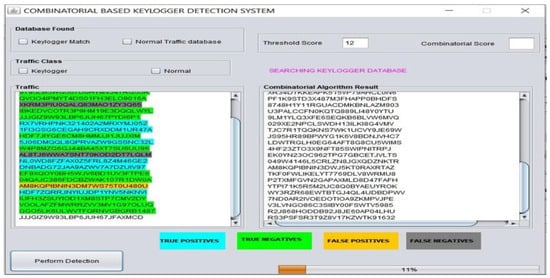 The similarity score can be a match score, which, whether expressed as a mismatch score or not, is always positive for a reward of the perfect match between the unknown pattern and a provided database. This is fine for any discrepancy between the unknown pattern’s resemblance to a particular database. The match and mismatch scores in this study rely on the employed threshold values. Based on the accuracy, a threshold value of 12 is chosen. Values that are above the threshold denote matches, whereas values that are below the threshold denote mismatches. A number below the cutoff represents a new keylogger signature to be gathered in the updated database of combinatorial Algorithm 2. Equation (5) can be used to represent combinatorial Algorithm 2’s analytical engine.