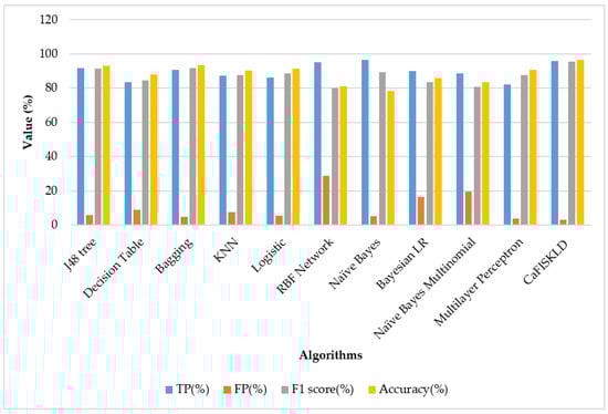 Figure 5 shows a performance comparison based on the true positive, false positive, F1 score, and accuracy metrics. The true positive of CaFISKLD exhibited the highest value, 96%, compared to that of the Multilayer Perceptron, which exhibited the lowest value, 82.2%. Similarly, CaFISKLD showed the best result compared to the RBF network, versus the other methods, in terms of the false positive rate, = 3% and 28.8%, respectively. The accuracy of CaFISKLD showed better results compared to that of Naive Bayes, with values of 96.543 and 78.353, respectively. Hence, bagging showed the closest performances to CaFISKLD with the true positive, false positive, F1 score, and accuracy metrics of 90.7%, 4.7%, 91.6%, and 93.480% and 96%, 3%, 95.5%, and 96.543%, respectively.