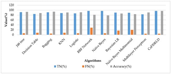 Figure 6 shows the performance comparison based on the true negative, false negative, and accuracy metrics. The true negative of CaFISKLD exhibited the same value as the RBF network and Naive Bayes methods, 97%. CaFISKLD also showed a lower false negative compared to the RBF network and Naive Bayes methods, 4%, 29%, and 6%, respectively. The Multilayer Perceptron showed the lowest values in terms of true negative and false negative, 83% and 4%, respectively.