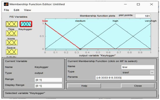 If the hard drive is busy, and the user is not doing anything, the keylogger could send its data to a hacker or upload it to a cloud account. Increased hard drive activity is simply referred to as activity. The fuzzy membership set mentioned in Equation (6) refers to these input variables. The defined membership set’s members are present in varying degrees between 0 and 1.