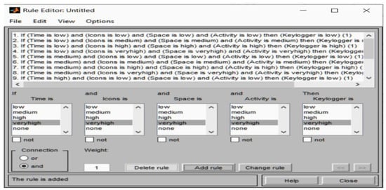 The idea of fuzzy rules established on the membership set for keylogger classification is used by the fuzzy inference engine. These fuzzy rules are designed to forecast the class for a specific keylogger. The root mean square (RMS) was employed by the fuzzy inference technique to support its conclusions. Equation (9) provides the RMS equation.