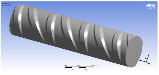 In the next step, the geometry model was implemented into ANSYS 2020 R1 Workbench. For each diameter, six geometry models were designed. All geometry parameters were kept constant except the fillet radius (Section 2.2). The radii were sorted by size. The first geometry model was designed using minimum values of r for alternating and parallel ribs. With further models, the radii were increased. No further combinations mixing smaller and larger radii on different sides of the model were investigated because an influence could be neglected (Section 3.4). All 3D modeling was conducted with the ANSYS DesignModeler. Table 3 shows the material parameters of B500B implemented in the simulations. Although tensile strength and yield strength were implemented, the material model selected was linear elastic, allowing for a simulation beyond yield and tensile strength. Thus, a comparison between the local linear elastic stress and the actual material strength (determined by tensile tests on microstructure specimens, Section 2.3) was carried out.