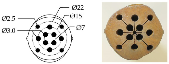 Specimen distribution over the cross-section containing the different depths and diameters of the cylindrical microstructure specimens (left), and cross-section of the whole rebar after eroding the microstructure specimens (right).