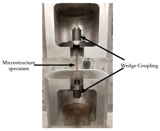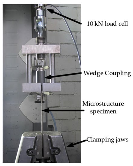 The tensile tests were carried out in a ZWICK Roell Z600. For the microstructure specimens, a maximum force of approximately 10 kN was expected. Therefore, a 10 kN load cell (class 0.5 according to [28]) was used to increase the accuracy in this force range. Figure 4 shows the test setup. The specimen was fixed at the top by a wedge coupling system and at the bottom by clamping jaws. The strain was recorded using a “videoXtens” optical extensometer (class 0.5 according to [29]) by ZWICK Roell. Focusing the optical extensometer on the specimen surface only allows for a measurement of the specimen elongation until its failure and without measurement artifacts resulting from the clamping at its top bearing.