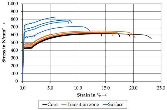 The results of the core specimens show very small deviations according to yield and tensile strength. The graphs are almost congruent, with only a few variations of Agt visible. Similar results were detected in the transition zone. The observed stress is slightly higher than those of the core specimens. The surface specimens, however, show a significantly higher tensile strength than the core and transition zone specimens. A decrease in the strain can also be detected. The core and transition zone specimens possess a distinct yield stress, unlike the surface. One specimen from every zone was neglected (not depicted) due to a failure in the clamping area.