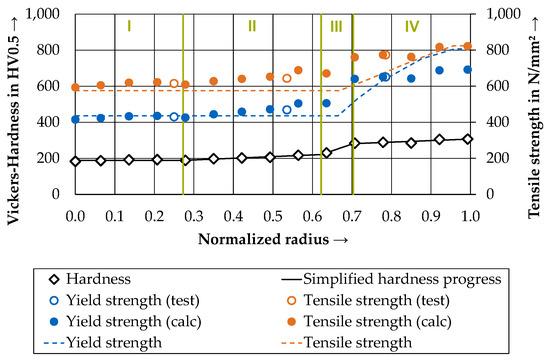 The yield ratio indicates the mathematical relationship between tensile strength and yield strength. Due to the large deviation in the yield ratio between ferrite/perlite (core) and tempered martensite (surface) (Figure 7), a jump in conversion was assumed. For the first three zones, there is good agreement with the values from the work in [6] (Figure 8). In zone IV, clear deviations can be found.